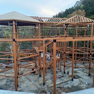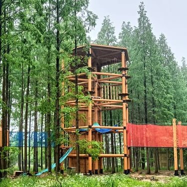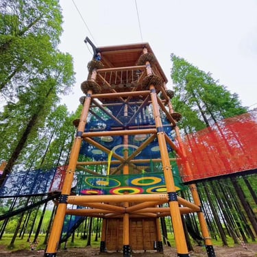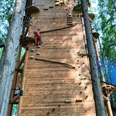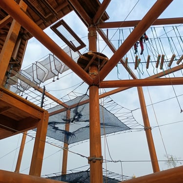 Tour en bois: 2 étages de parcours acrobatique en hauteur (28 obstacles), 2 étages de filet crochet (2x 65m²), un mur d'escalade/ via ferrata