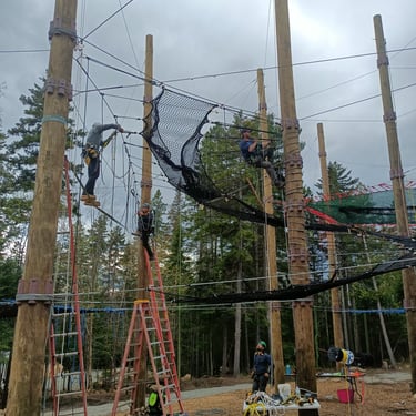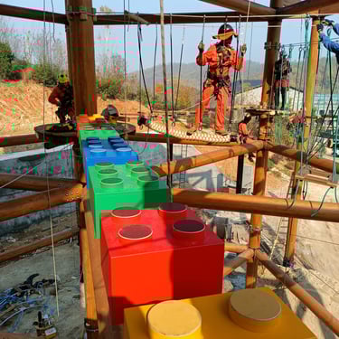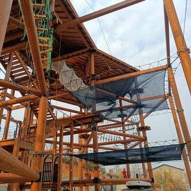 Double tour d'activités en bois. 2 x 2 étages de parcours acrobatiques en hauteur (36 obstacles), 2 mers de filet crochet de 65 m²